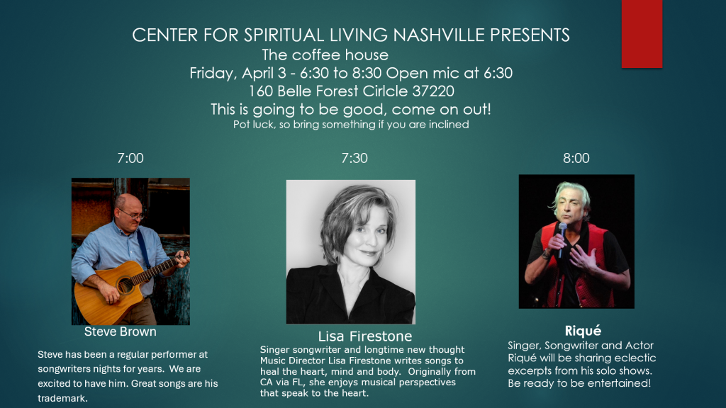 Speaking of the Coffeehouse, our next one will be Friday, April 3rd. As usual, we will start with our Open Mic from 6:30 – 7 P.M. (Signup starts at 6 p.m. with 7 slots open). If you are so inclined, please share an original song, poem, comedy bit or short story (Maximum 5 minutes per presentation, please). Our 3 Spotlight Performers are Steve Brown, Lisa Firestone, and Rique. Please see flyer below for brief descriptions of each Spotlight. They are all very different but all very talented, which is why we are having them back. Potluck snacks and drinks, and love offering to CSLN greatly appreciated.